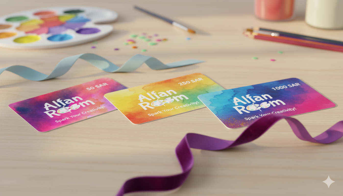 بطاقة هدايا إلكترونية "ألفان روم": الهدية الإبداعية المثالية، متوفرة بقيم 100، 250، و 1000 ريال سعودي (ر.س)، يتم تسليمها فوراً عبر البريد الإلكتروني ليختار أحباؤك مغامرتهم الفنية بأنفسهم.